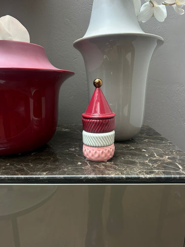 Contenedor decorativo en cerámica con diseño apilado en tres tonos y tapa en forma cónica con detalle dorado, ideal para dar un acento colorido y original a tus espacios.