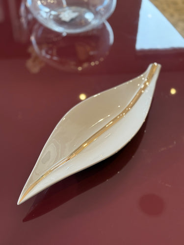 Centro de mesa en cerámica con forma orgánica de hoja, acabado brillante y detalle en dorado, ideal para aportar elegancia y sofisticación a la decoración.