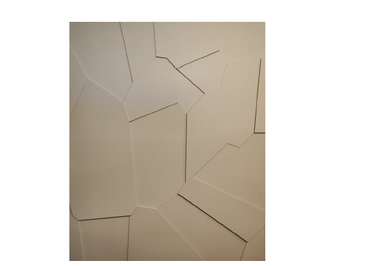 La pieza es un relieve geométrico blanco con marco de madera natural. El acabado transmite pureza, simplicidad y orden, pero al mismo tiempo dinamismo por la fragmentación de las piezas.