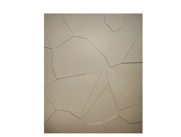 Es una composición en tonos beige, formada por planos irregulares que se ensamblan como fragmentos geométricos, creando relieve y una sensación de superficie quebrada o en tensión.