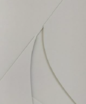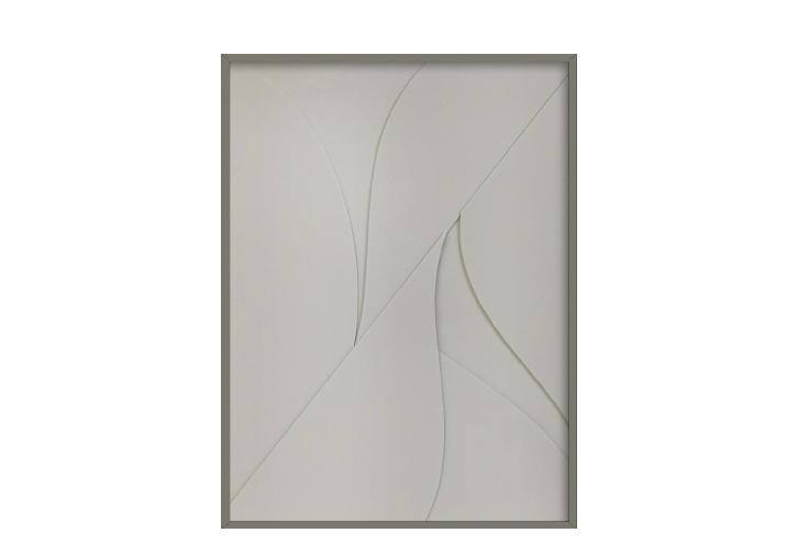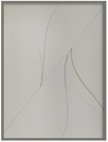 Es una composición minimalista en relieve, formada por planos blancos que se cruzan en líneas curvas y rectas, generando un efecto sutil de movimiento y armonía.