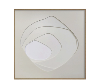 Este relieve en capas concéntricas blancas dentro del marco de madera transmite suavidad, pureza y movimiento orgánico, casi como una piedra pulida, una gota expandiéndose en el agua o incluso un capullo que se abre.