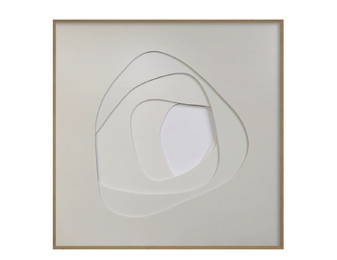 Este relieve en capas concéntricas blancas dentro del marco de madera transmite suavidad, pureza y movimiento orgánico, casi como una piedra pulida, una gota expandiéndose en el agua o incluso un capullo que se abre.