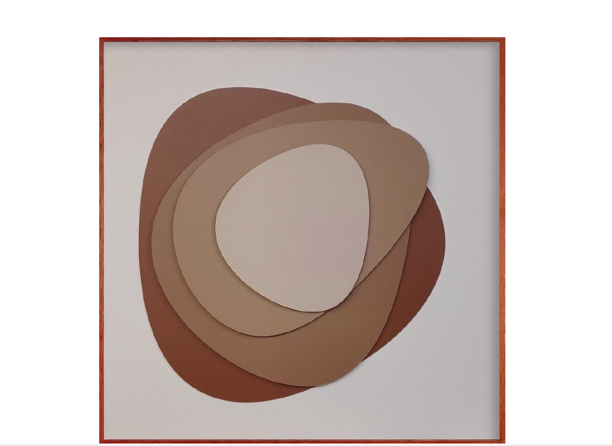 Es una obra abstracta con formas orgánicas superpuestas en tonos tierra, que crean un efecto de volumen y profundidad sobre un fondo blanco, evocando calma y equilibrio natural.