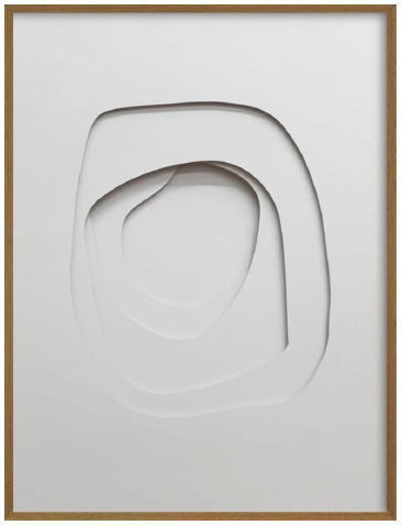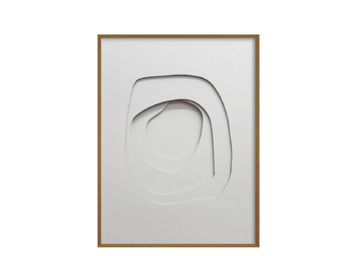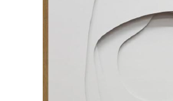 Este relieve en capas concéntricas blancas dentro del marco de madera transmite suavidad, pureza y movimiento orgánico, casi como una piedra pulida, una gota expandiéndose en el agua o incluso un capullo que se abre.