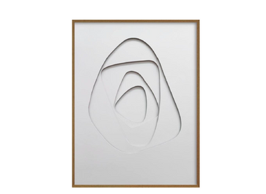 Este relieve en capas concéntricas blancas dentro del marco de madera transmite suavidad, pureza y movimiento orgánico, casi como una piedra pulida, una gota expandiéndose en el agua o incluso un capullo que se abre.