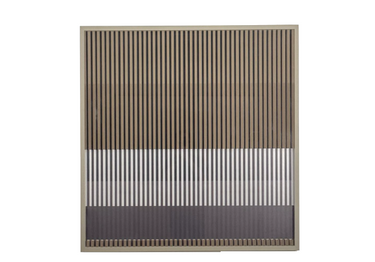 Obra geométrica en tonos tierra y nude que juega con la repetición de franjas verticales. La composición genera un efecto óptico de vibración y movimiento, evocando equilibrio entre naturaleza y estructura.