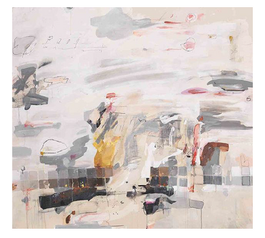 Composición abstracta con velas claras, manchas cálidas y una base cuadriculada en grises que aporta estructura dentro del gesto libre y expresivo.