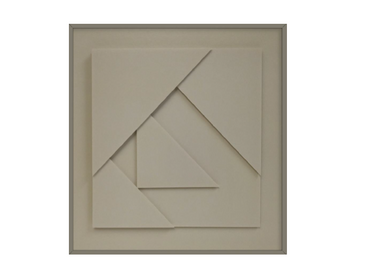 Composición minimalista en tonos neutros, con planos triangulares y cuadrados que se superponen creando un juego de profundidad y equilibrio visual.