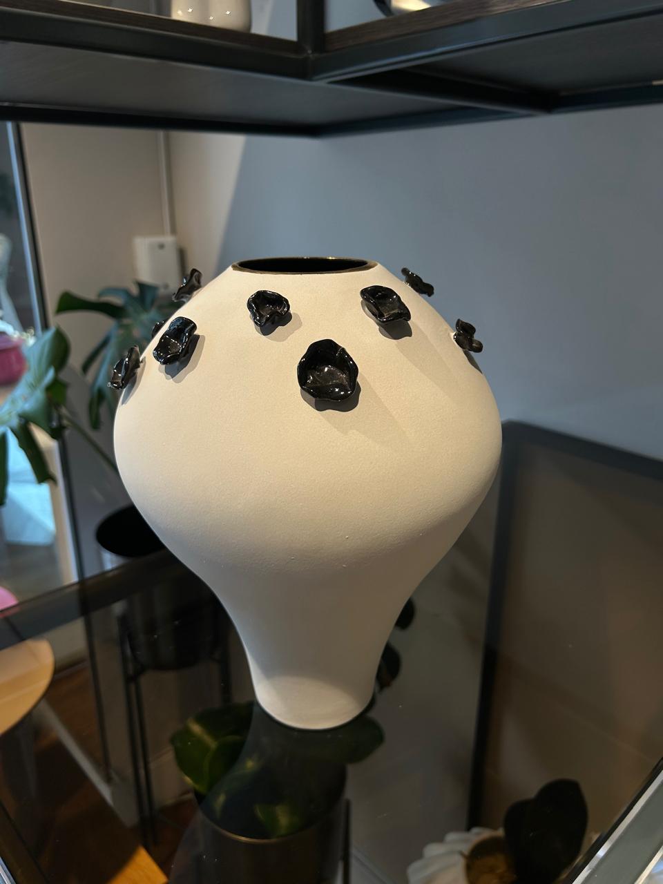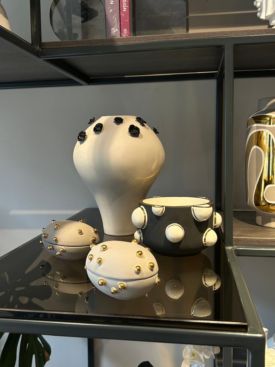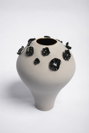 Jarrón decorativo de Wayland Gregory, en cerámica esmaltada con detalles en oro de 24 k, de forma orgánica y acabado mate. Su diseño artesanal combina elegancia y modernidad, ideal para dar un toque sofisticado a cualquier espacio.