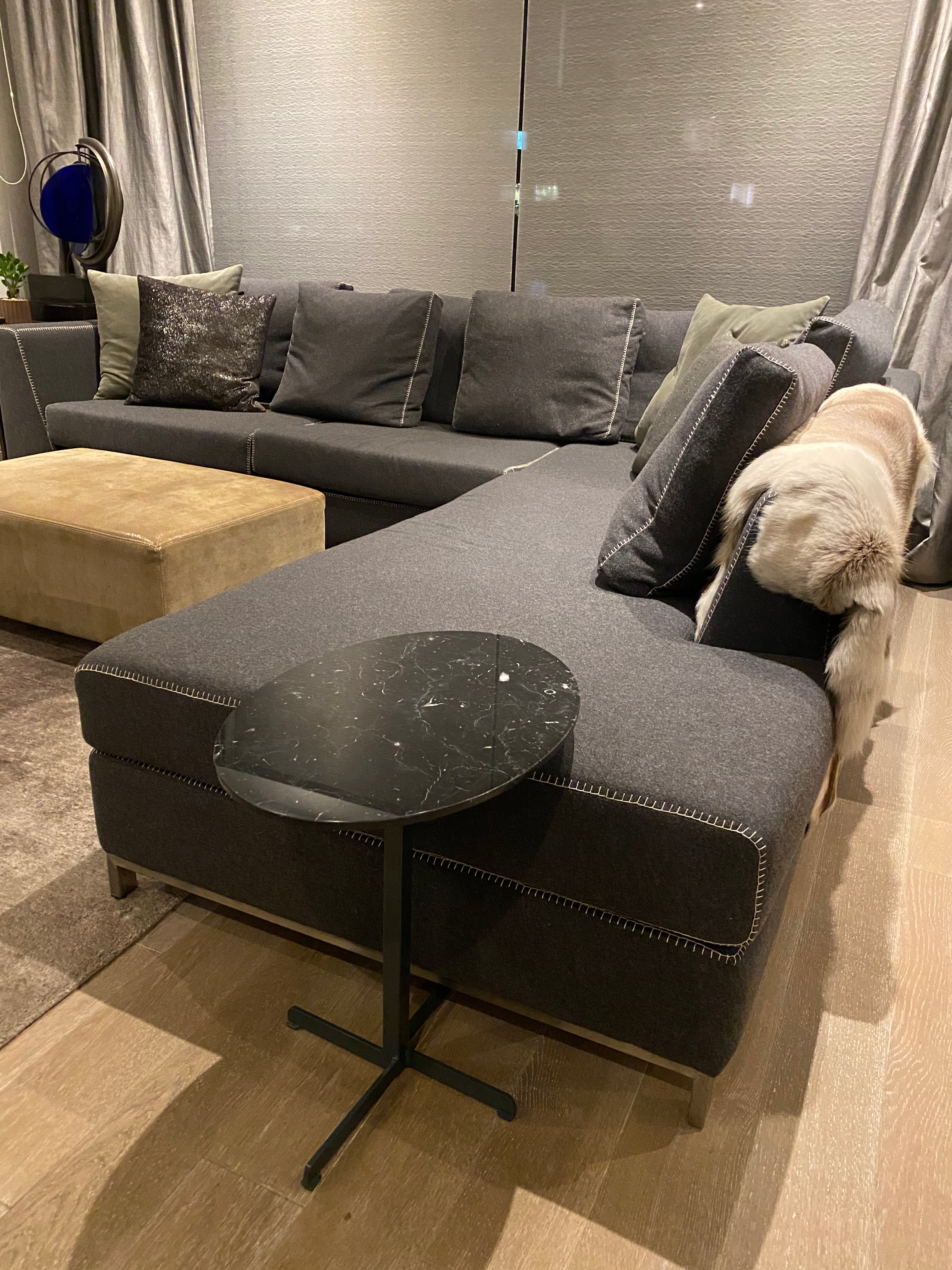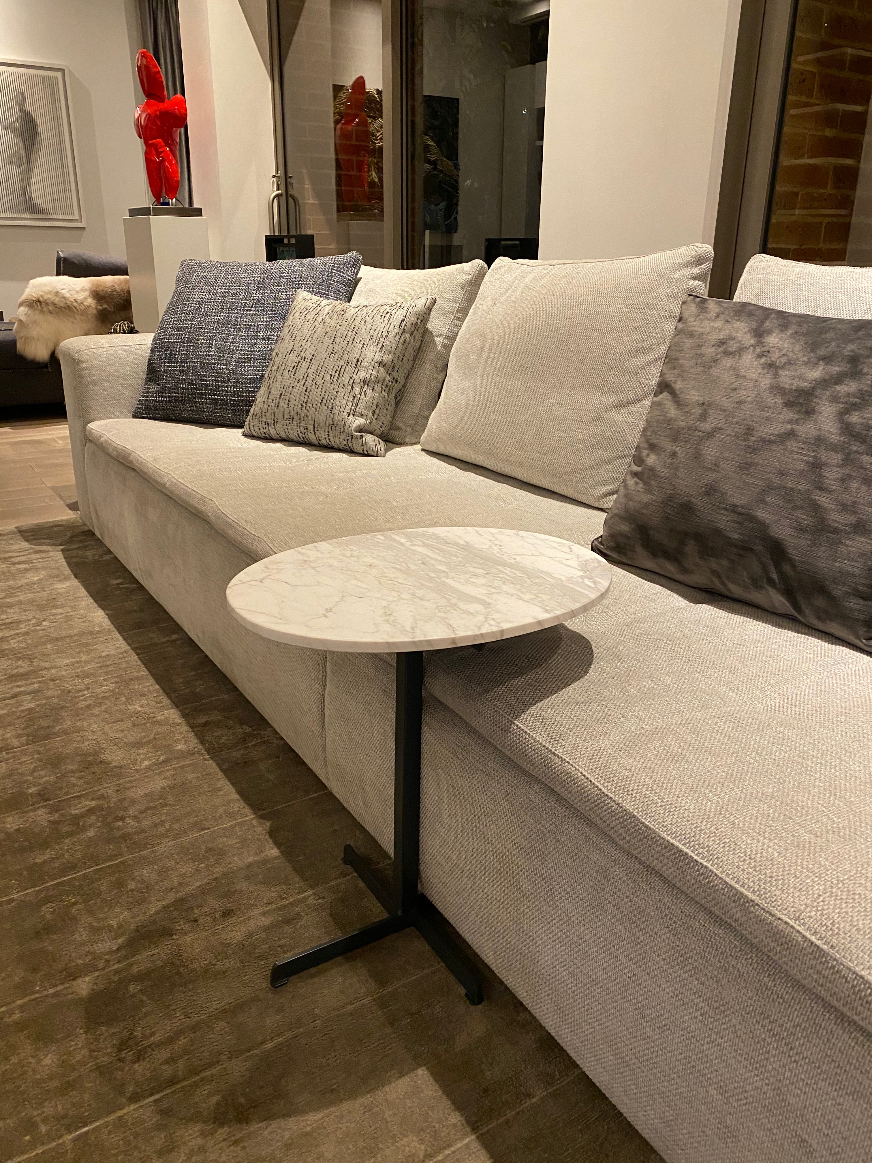 Mesa auxiliar ovalada perfecta para apoyar los grandes sofás, poltronas o cualquier espacio que lo requiera. Base en metal pintada de gris oscuro y tapa de mármol blanco volakar.