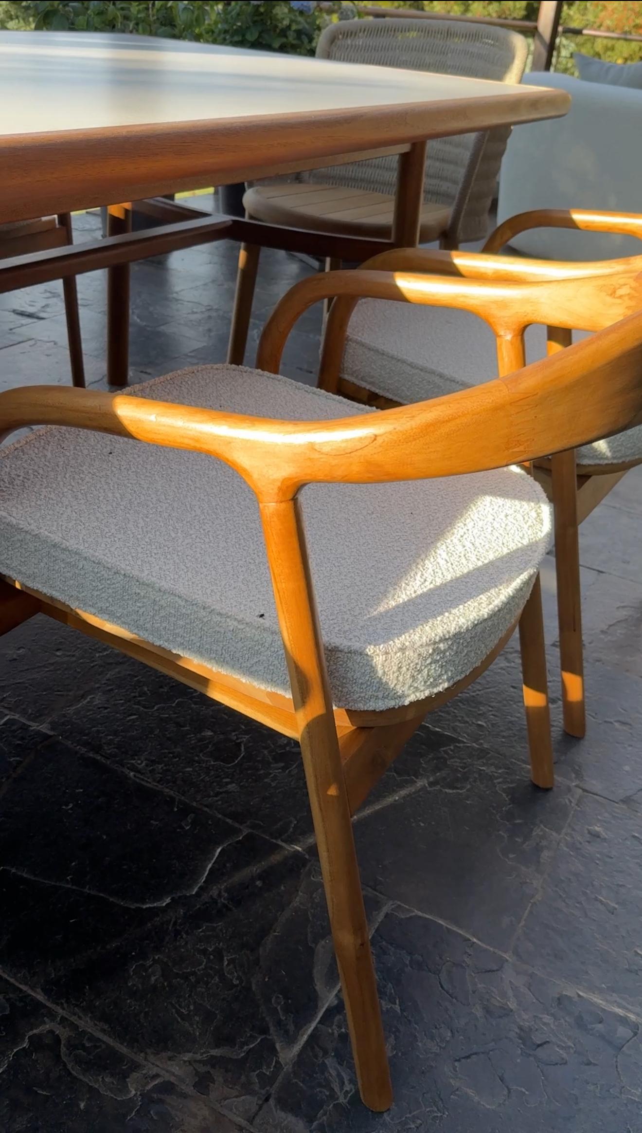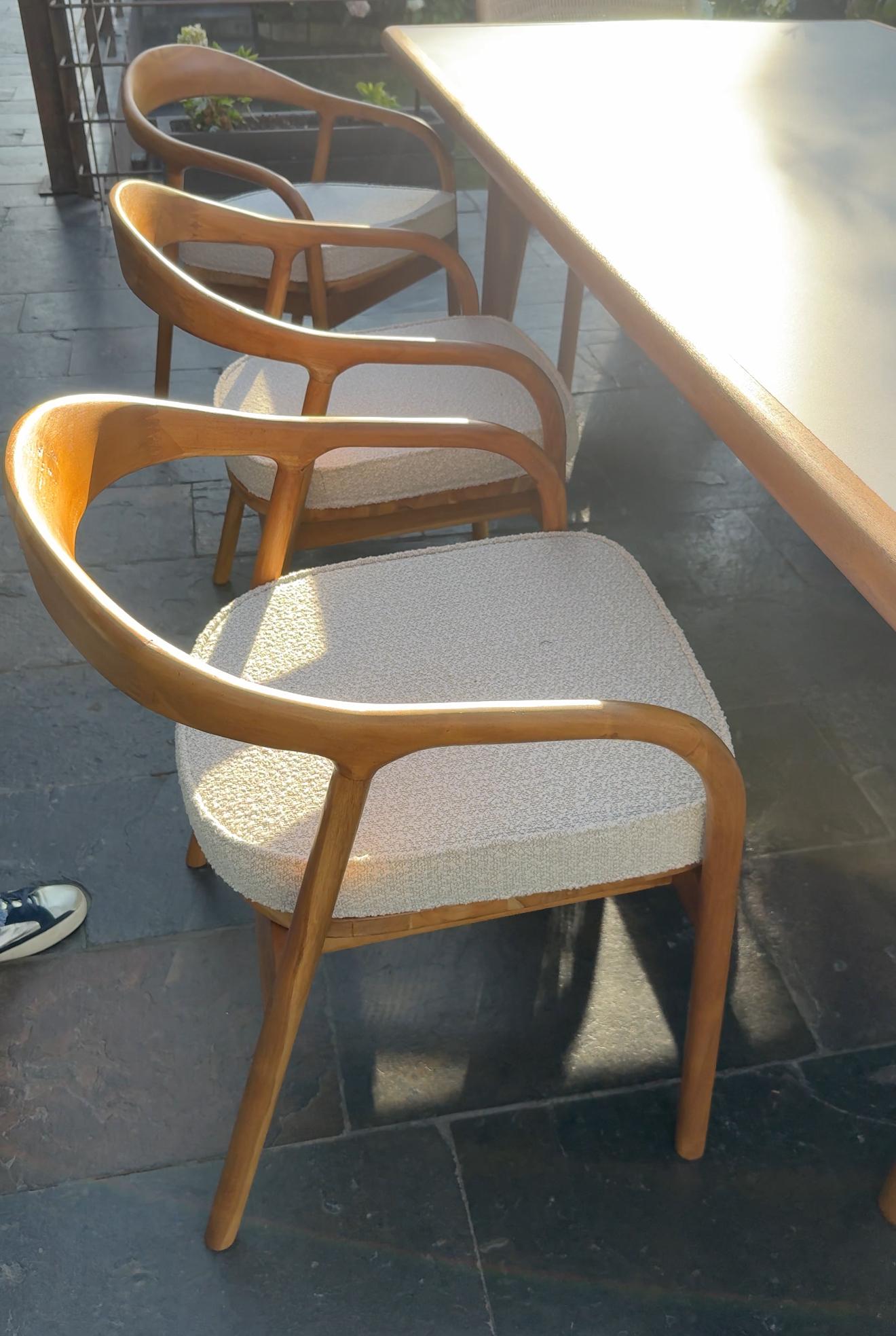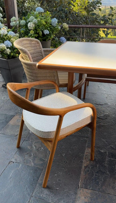 Silla de comedor estructurada en madera Flor Morado o Teka, resistente y duradera, con acabado a elección que resalta la calidez de la madera. Asiento y respaldo tapizados para mayor confort, disponibles en tela a elección. Diseño versátil que combina con diferentes estilos de comedor. Para Interior y exterior.