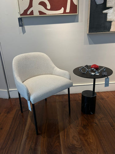Silla de comedor estructurada en madera, resistente y duradera, con acabado a elección que resalta la calidez de la madera y patas metálicas. Asiento y respaldo tapizados para mayor confort, disponibles en tela a elección. Diseño versátil que combina con diferentes estilos de comedor.